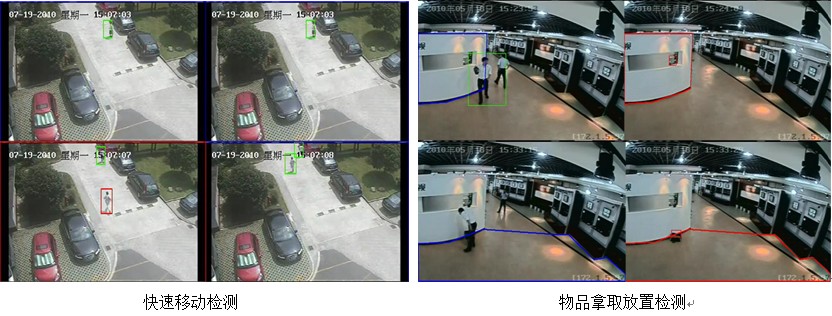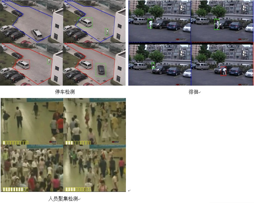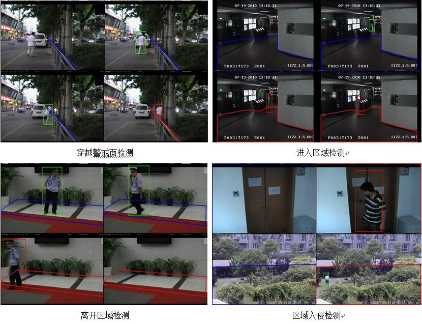 行为分析实现以下视频分析检测:穿越警戒面检测、进入离开入侵区域检测、物体快速移动检测、物品拿取放置检测、停车检测、徘徊检测、人物聚集检测。