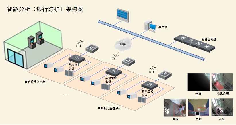 5) 对重点敏感部位需要更好的安防监控技术手段,需要对各种事件如盗窃、破坏、入侵和其他可疑行为及时发现和处理。需要应用视频智能分析技术使传统的被动监控模式转化为主动监控,根据自身安防需要设置各种规则,对各种可疑事件和行为进行分析报警,并联动视频图像记录行为过程,提高安防应用水平。